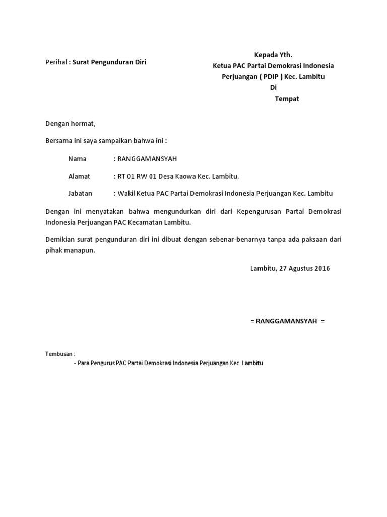 Contoh surat pengunduran diri kerja, organisasi, sekolah atau instansi untuk semua keperluan baik resmi maupun non resmi. Yang bertanda tangan di bawah ini : Contoh surat penguduran diri sangat banyak macamnya mulai dari pekerjaan, organisasi, sekolah, jabatan, guru, kuliah, perangkat desa, bahkan sampai tingkat rt/rw. Ade yudha saputra jabatan di bem : 10 contoh surat pengunduran diri kerja baik dan sopan.